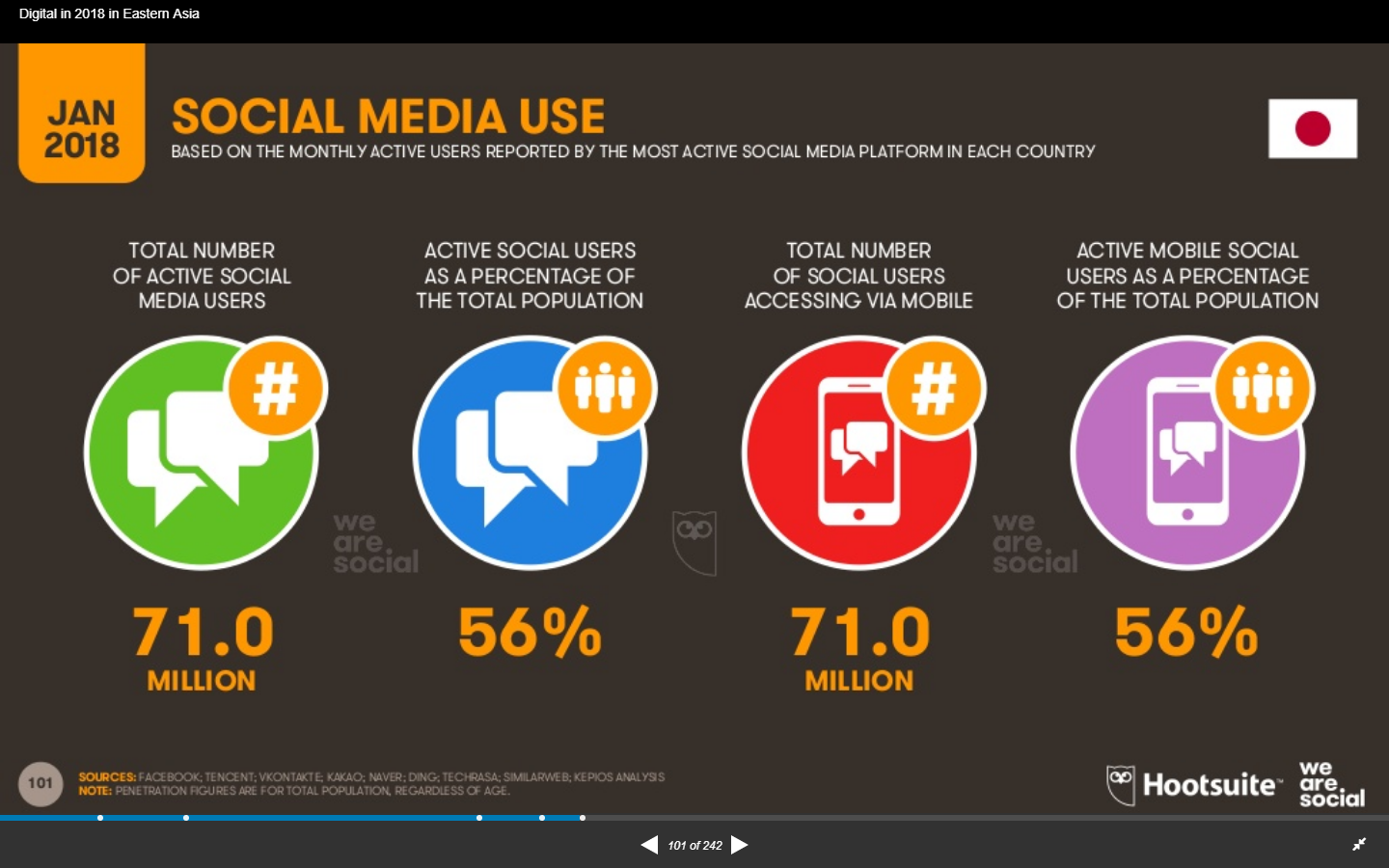 日本では総人口の多さから、SNSユーザー数自体はタイよりも多い7,100万人ですが、これは人口の56%、インターネット利用者の60%になり、SNSの利用率はタイよりも低いと言えます。